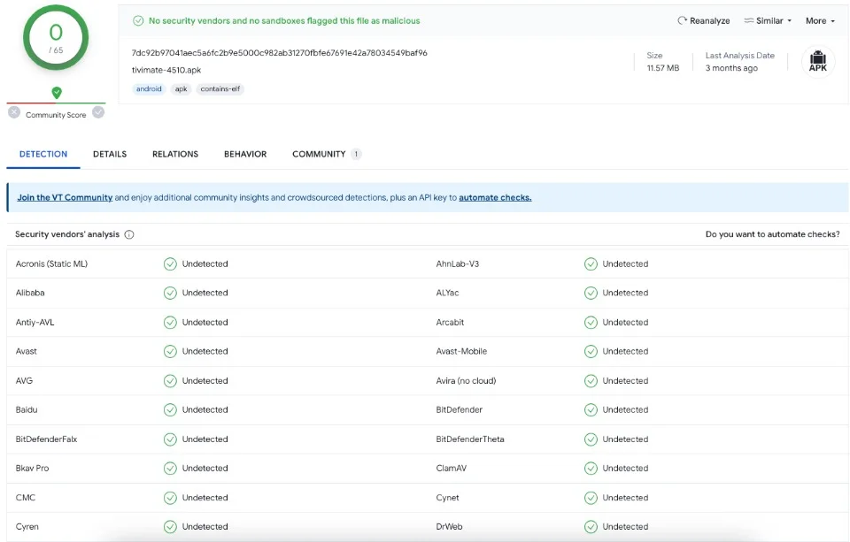 För att säkerställa trygghet har APK-versionen av TMtestats i VirusTotal, där den fått grönt ljus från alla säkerhetsleverantörer.